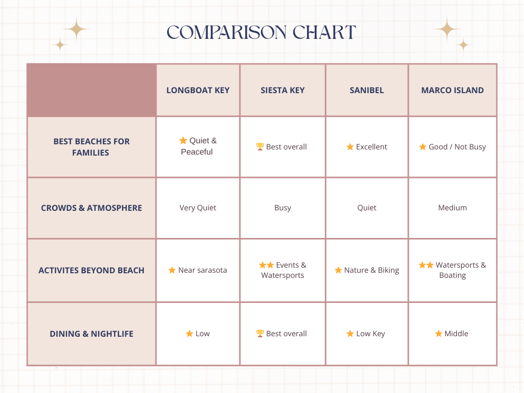In this guide, we’re breaking down four of Florida’s most beloved beach towns — Longboat Key, Siesta Key, Sanibel Island, & Marco Island— with a clear, honest look at the pros and cons of each for a family beach vacation. By the end, you’ll have a much better sense of which destination matches your family’s pace, priorities, and vacation goals.
